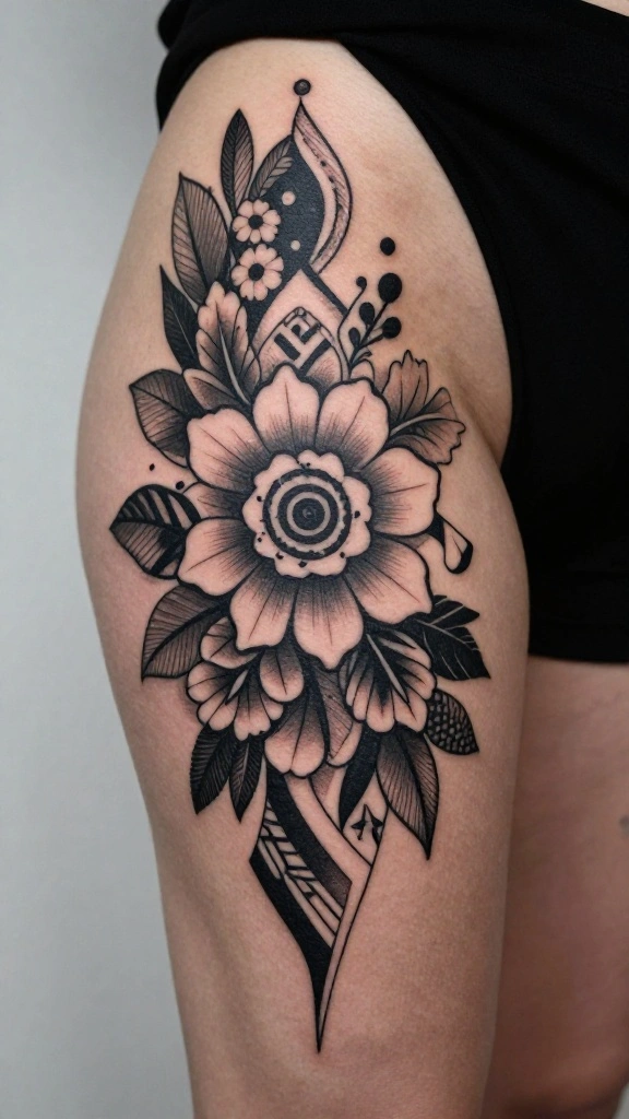 Merging different tattoo styles can lead to truly unique art that tells your personal story. Combining elements from floral, geometric, and abstract designs creates a striking thigh tattoo that reflects your diverse interests. The bold blackwork emphasizes the contrasts between styles, making your tattoo captivating.