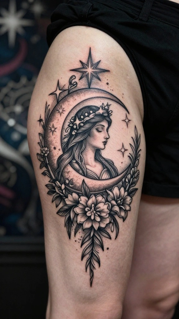 This tattoo not only enhances your beauty but also symbolizes your connection to the lunar mysteries and your inner strength.