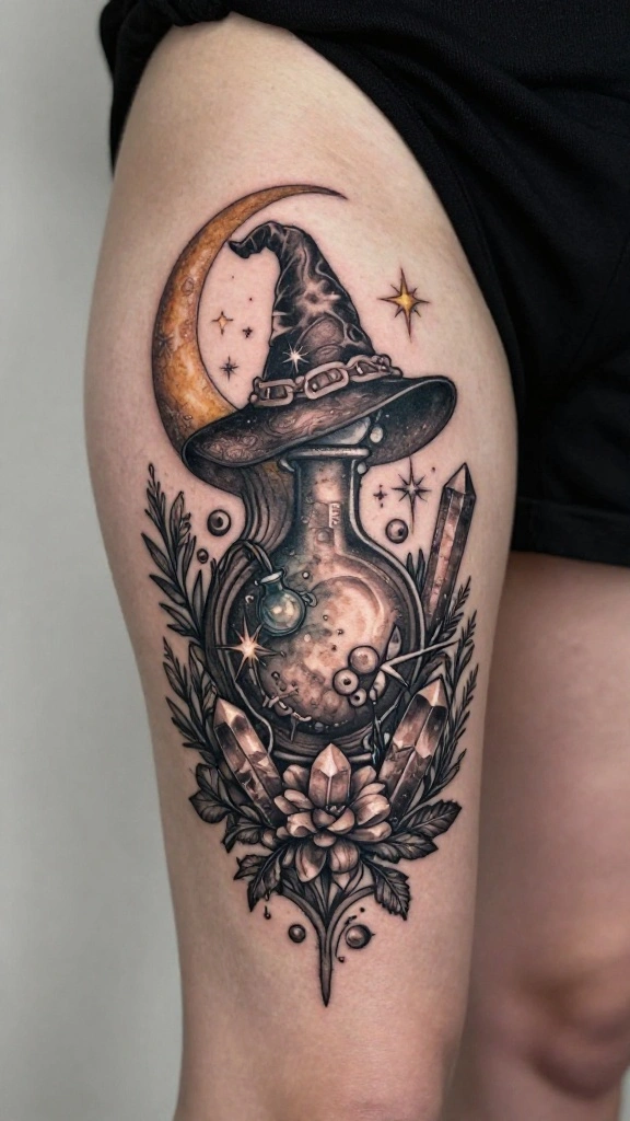 Witchcraft and mysticism inspire many modern tattoos, making a witch-themed thigh tattoo an intriguing choice. This design can feature potions, brooms, and crystals, beautifully blending femininity with empowerment. The combination of whimsical and dark themes creates an aesthetic that is both enchanting and edgy.