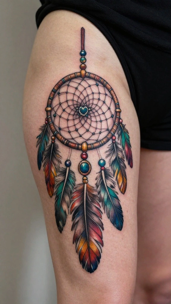 Dreamcatchers are beautiful motifs representing protection and the pursuit of dreams, making them a meaningful choice for your thigh. A dreamcatcher tattoo symbolizes safety while connecting deeply to your aspirations and inner strength. This design can feature intricate feathers, beads, and webbing, creating a stunning visual narrative that captivates the eye.