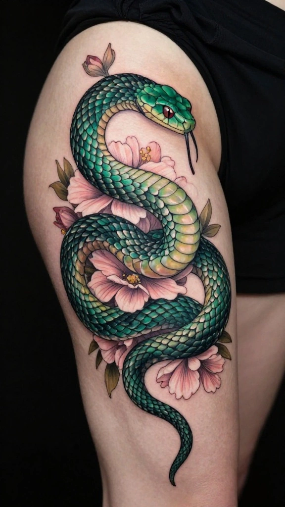 To enhance the femininity of your tattoo, consider adding floral elements that soften the overall look. The contrast between the serpent’s boldness and the delicate flowers creates a stunning balance that tells a story.