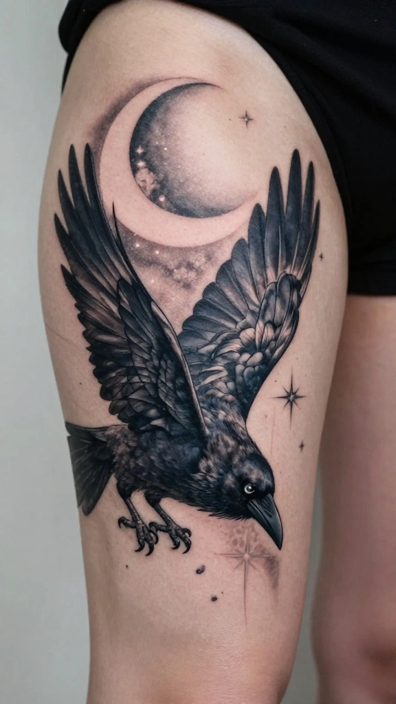 Raven tattoos are steeped in symbolism, representing magic and mystery, perfect for a thigh piece. A design featuring a raven in flight or perched on a branch captures transformation and wisdom, reflecting the complexities of the feminine psyche. With detailed feathers and intense eyes, this tattoo makes a bold and enchanting statement.