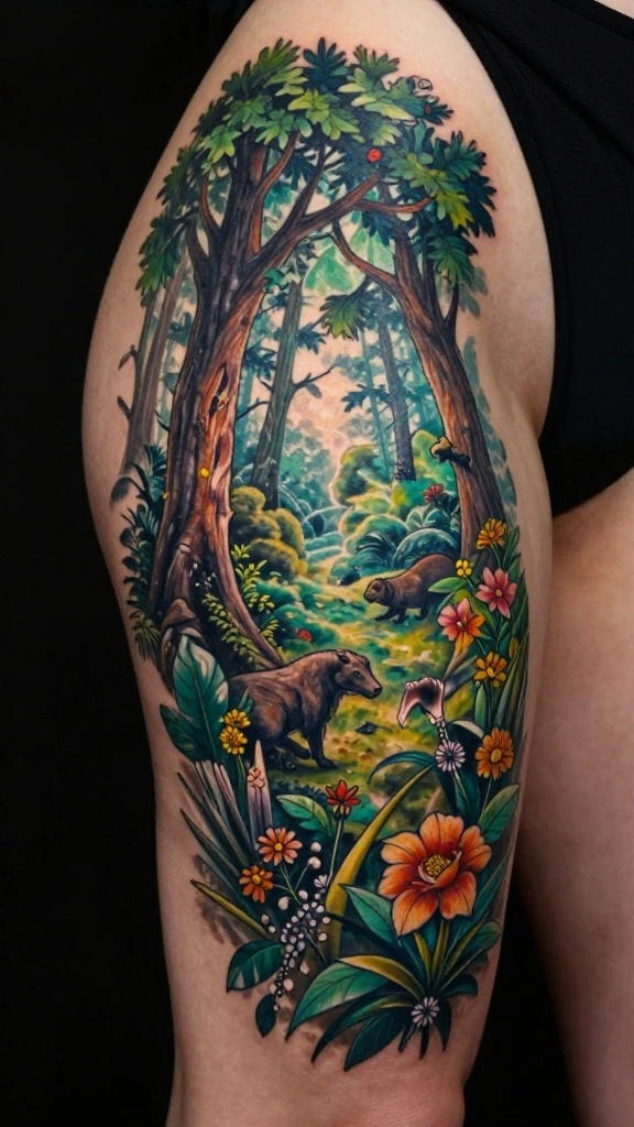 By selecting a color palette of rich greens, earthy browns, and vibrant floral accents, you can evoke feelings of wonder and mystery. Each element can hold personal significance, transforming the tattoo into a work of art that tells your story.