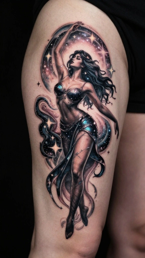 Celestial tattoos are gaining popularity, with stars and planets making bold impressions. A celestial dancer tattoo combines the grace of a dancer with the mysteries of the cosmos, beautifully representing the harmony between movement and the universe. The fluid lines of the dancer intertwined with celestial bodies create a magical and dynamic design.