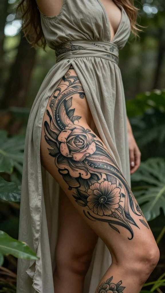 Consider a wrap-around design that travels from the outer thigh to the inner thigh, creating a continuous story that’s perfect for mysterious tattoo designs.