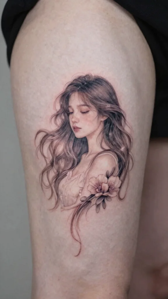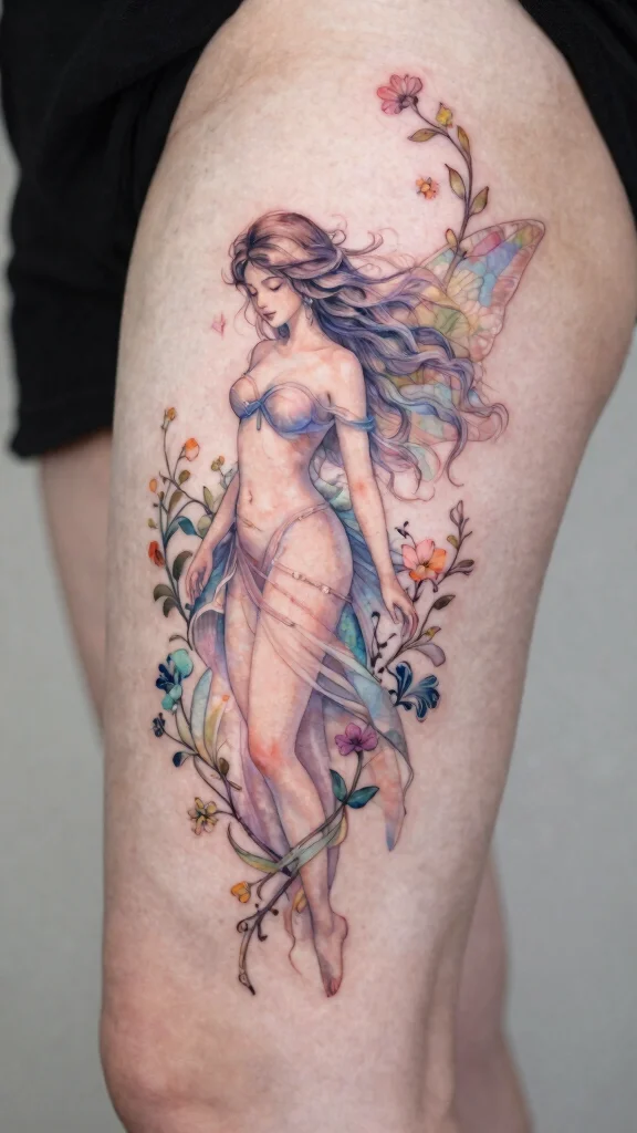 Nymph tattoos are enchanting, representing beauty, nature, and femininity. These idyllic figures are often connected to elements like water, trees, or flowers, making them a lovely choice for thigh tattoos. A nymph tattoo can capture grace and ethereal beauty, often illustrated in flowing poses that complement your body’s curves.