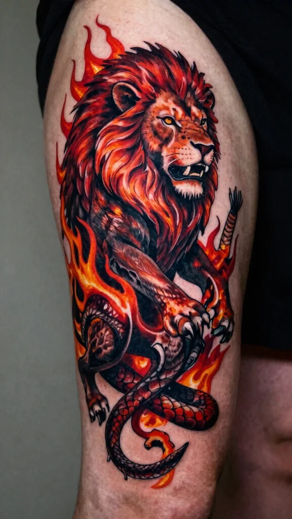 The Chimera, a creature of chaos and complexity, makes for a bold thigh tattoo. Featuring a lion’s head, goat’s body, and serpent’s tail, this design showcases strength and fearlessness. Many choose the Chimera to represent their inner warrior, merging various styles and colors for a striking visual impact.