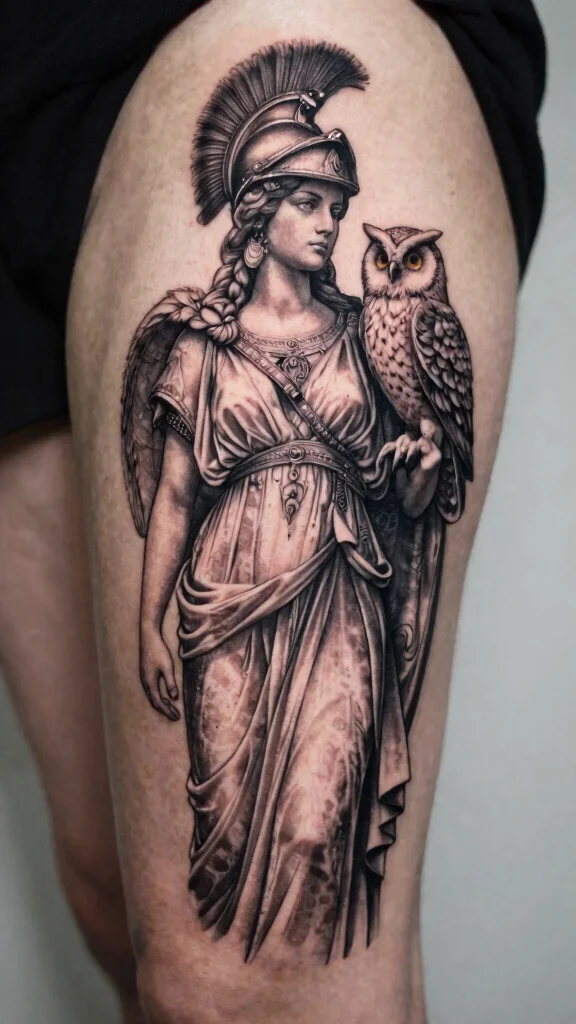 Athena, revered as the goddess of wisdom and warfare, makes for an inspiring thigh tattoo. Often portrayed with an owl or adorned in armor, an Athena tattoo signifies intelligence, courage, and strategic thinking. This intricate design can beautifully showcase her shield, featuring the emblem of the owl, a symbol of knowledge and insight.