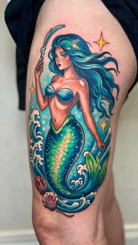 Fun fact: Siren tattoos on the thigh often balance danger and beauty, with 2-3 marine elements like shells or stars creating a personalized underwater story. These designs stay bold on curves and age gracefully, matching the mystery of the sea.