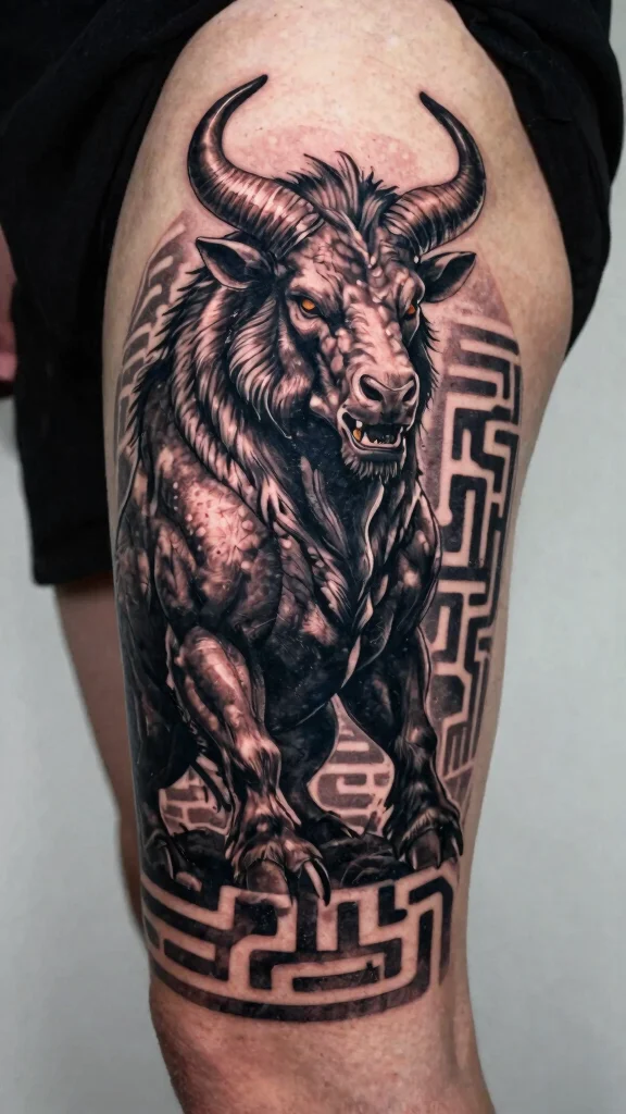 The Minotaur, a creature of fascinating mythology, makes for a striking thigh tattoo. Often portrayed within the labyrinth, this design symbolizes the inner struggle between humanity and primal instincts. A Minotaur tattoo can showcase its fierce nature while embodying themes of power and complexity.