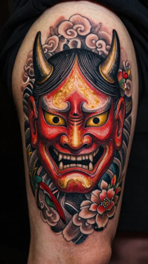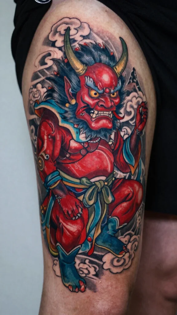 The Oni mask is a striking symbol in Japanese folklore, representing protection and strength. A thigh tattoo featuring an Oni mask can make a bold statement, embodying the fierce yet protective nature of this mythical figure. These tattoos often highlight intricate details, from the mask’s expressive features to its vibrant colors like red, blue, and black.