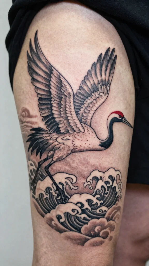 – Capture dynamic poses: The thigh tattoo space is perfect for depicting a crane in flight, symbolizing freedom and aspiration.