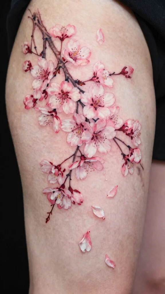 If you appreciate the fleeting nature of beauty, a cherry blossom tattoo might resonate with you. In Japanese culture, cherry blossoms, or sakura, symbolize the short-lived yet stunning beauty of life. A cherry blossom thigh tattoo can be elegantly designed, often showcasing soft pinks and whites that contrast beautifully against your skin.