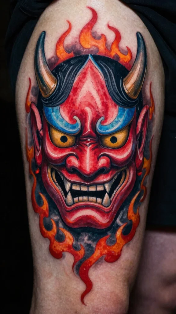 This Oni mask tattoo can be a striking declaration of strength and protection, reflecting your personal narrative of resilience.