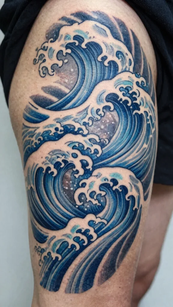 If you admire the power of nature, wave patterns make a beautiful tattoo choice. In Japanese tattoo art, waves symbolize fluidity, change, and the relentless movement of life. A thigh tattoo showcasing waves can be visually captivating and deeply symbolic, often combined with elements like koi fish or cherry blossoms for a more intricate design.