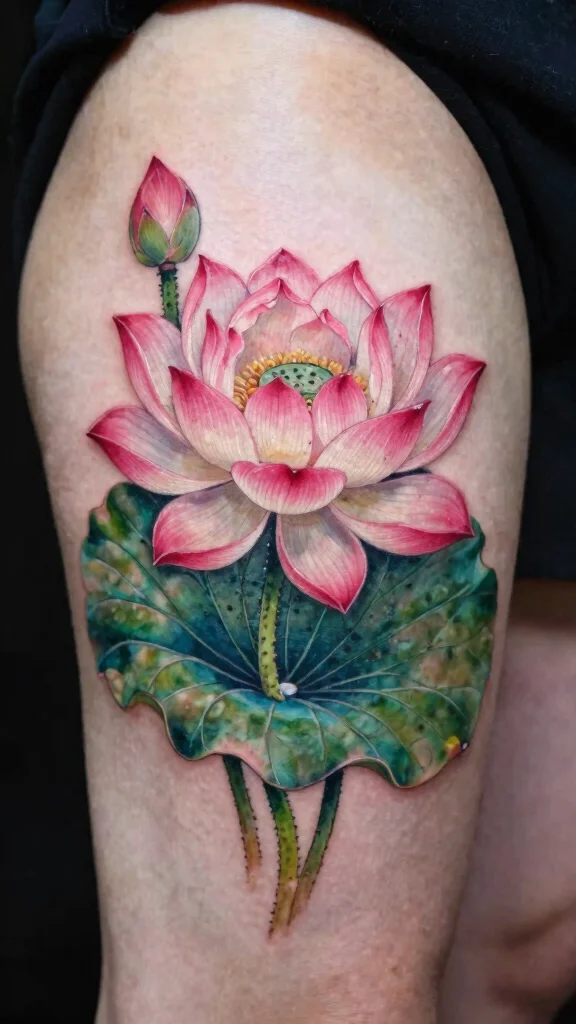 The lotus flower holds significant meaning in Japanese culture, embodying purity and spiritual enlightenment. A thigh tattoo featuring lotus blossoms can be incredibly beautiful and profound, symbolizing personal growth and the journey toward enlightenment. These tattoos are often adorned with vibrant colors, capturing the essence of the flower’s beauty.
