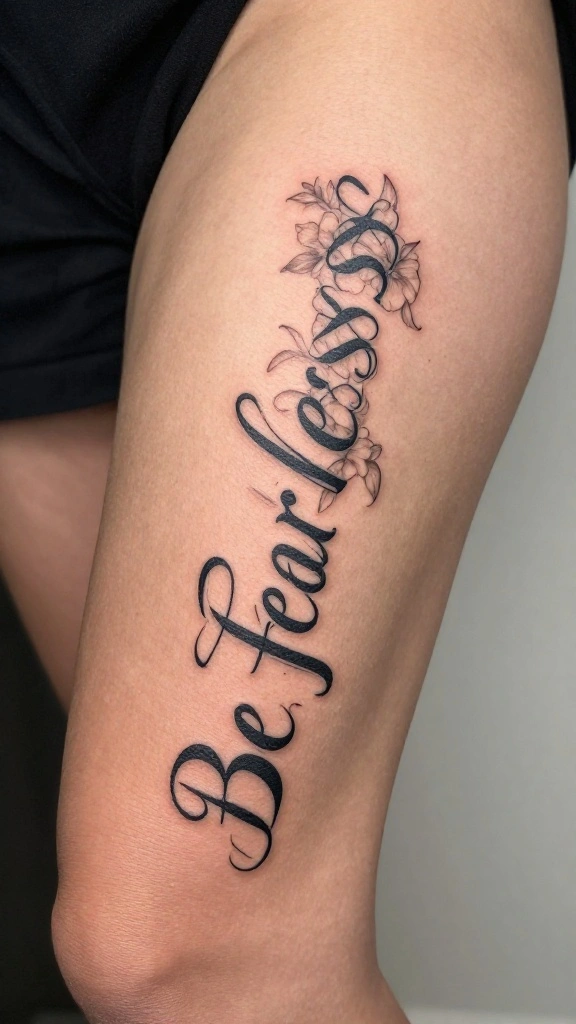 Embrace a mantra like ‘Be Fearless’ that resonates with your inner strength. This tattoo flows gracefully along your thigh, serving as a beautiful reminder to face life’s challenges head-on. Imagine how the elegant script can wrap around your body, bringing motivation and confidence every day.