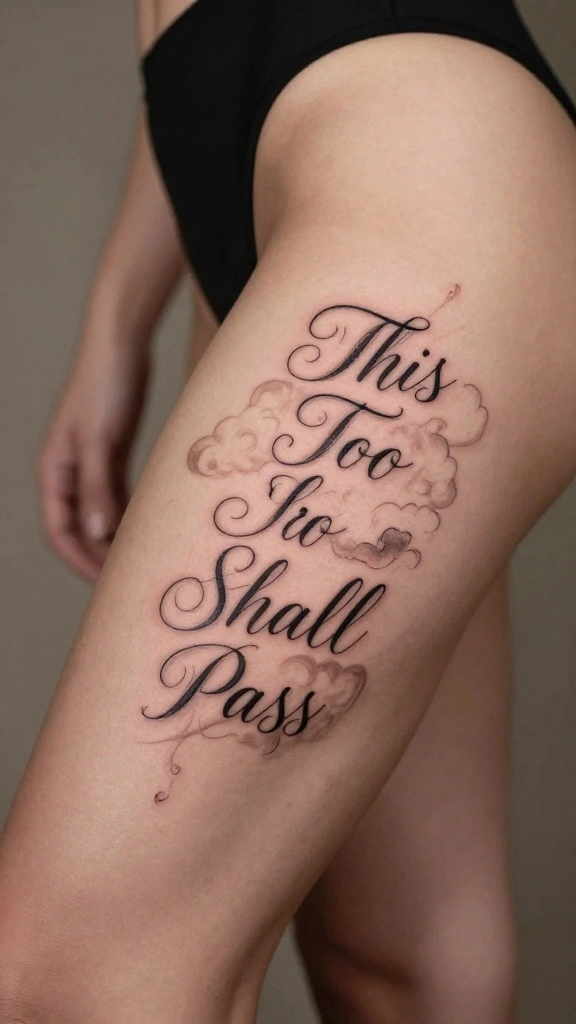 The phrase ‘This Too Shall Pass’ offers comforting wisdom, reminding you that all moments are temporary. This tattoo can be designed in elegant script that flows along your thigh, providing solace during challenging times. Incorporating elements like clouds or gentle waves can symbolize the fleeting nature of life, adding depth to the design.