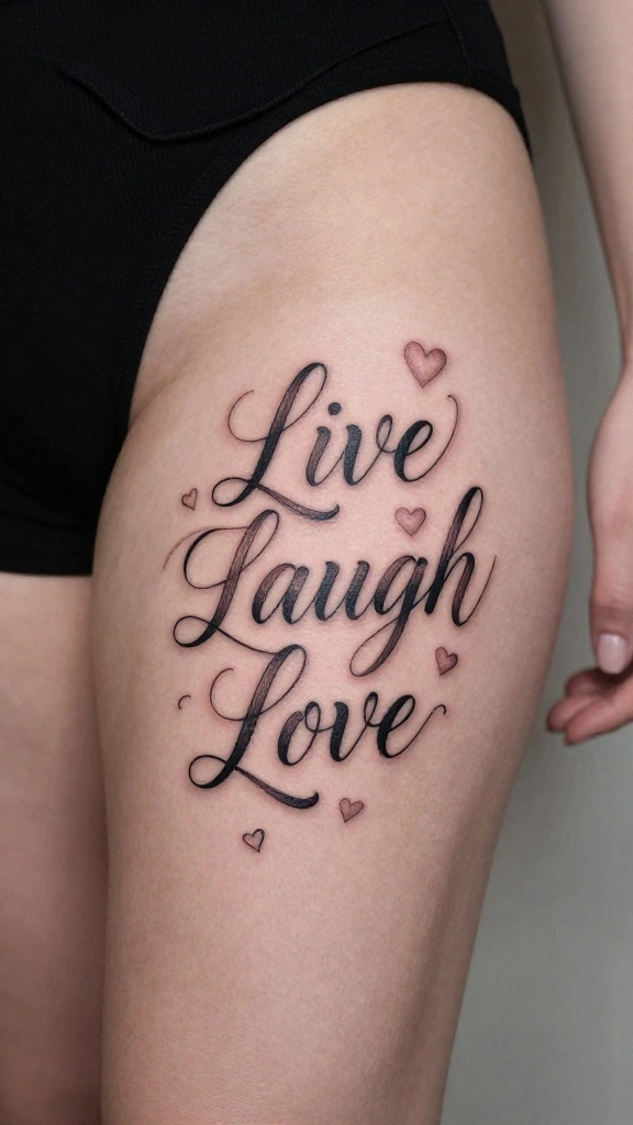 The phrase ‘Live Laugh Love’ encapsulates a joyful spirit and positivity. Imagine this tattoo crafted in a flowing script that gracefully dances across your thigh, making a vibrant statement about your outlook on life. Personalizing it with a style that resonates with you can make it even more special.