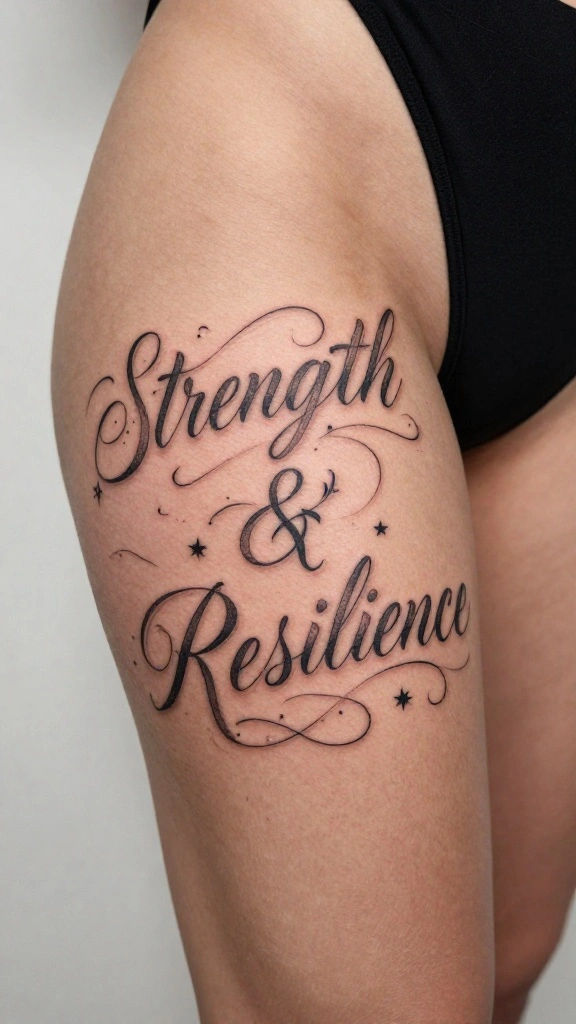 Choosing the right font and size sets the vibe and readability of your thigh tattoos script. Start with readability in mind—avoid ultra-thin letters that blur over time; opt for a clean elegant script tattoos or a slightly bolder script for longevity. Try pairing a primary script font with a simple sans-serif or small flourishes to keep the lines crisp. Always test by printing the text in your chosen font and marking it on your thigh as a stencil, then adjust the size to fit the space. Discuss with your artist to balance letter spacing, ascenders/descenders, and the curvature of your thigh. Good options include lettering tattoo designs that enhance the natural contour of your leg. Perfect for script tattoo ideas that stay legible and beautiful over time.
