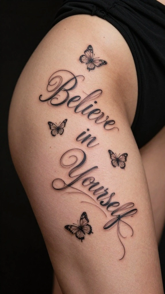 A tattoo saying ‘Believe in Yourself’ blends motivation with stunning artistry. Imagine the elegant script wrapping around your thigh like a gentle breeze, infusing your belief in your potential with life. Adding small stars or butterflies can symbolize transformation and hope, enhancing its beauty.