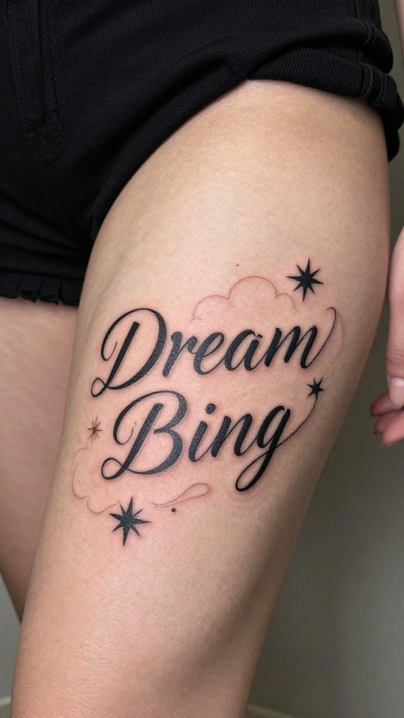 Having ‘Dream Big’ inked in flowing script on your thigh is a gentle nudge to reach for your aspirations. This phrase encourages you to aim high, making it a truly inspiring choice. Surrounding the script with whimsical stars or clouds can add a dreamy aesthetic, enhancing its charm.