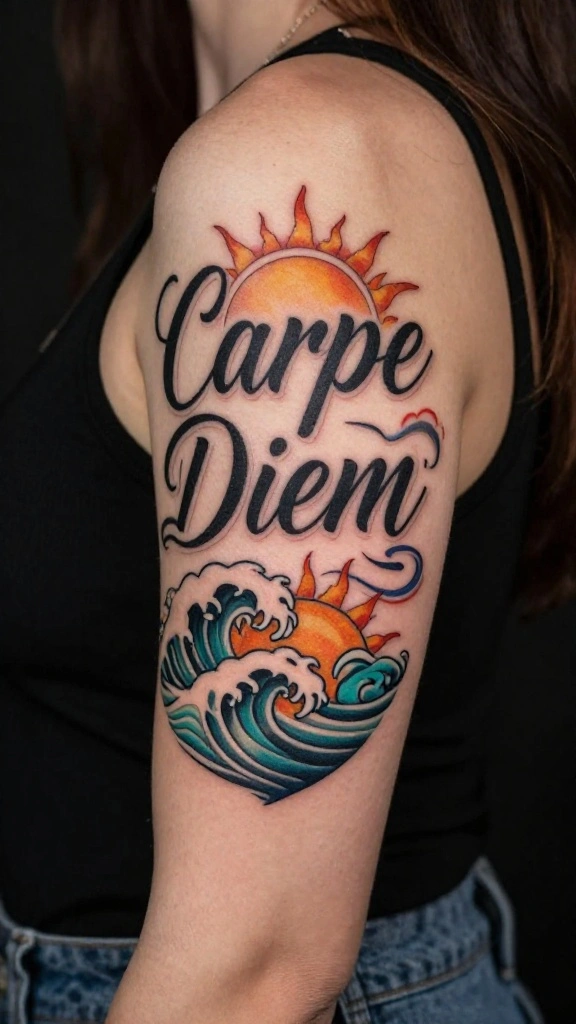 The phrase ‘Carpe Diem’, meaning ‘Seize the Day’, encourages you to live fully. Imagine this tattoo designed in an elegant, bold script that showcases your passion for making the most of every moment. Adding elements like the sun or waves can further symbolize the essence of this mantra.