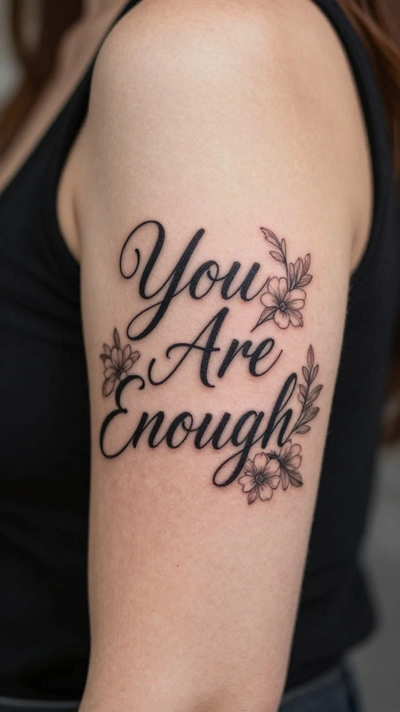 The phrase ‘You Are Enough’ serves as a heartwarming affirmation everyone should carry. This tattoo can be crafted in an elegant script that radiates warmth and acceptance. To enhance the design, consider incorporating floral patterns or vines that wrap around the text, symbolizing growth and beauty.