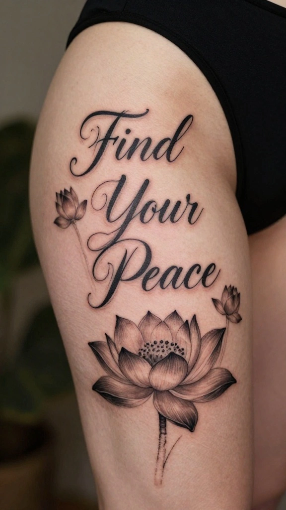 The phrase ‘Find Your Peace’ gently reminds you to seek balance and tranquility in life. Imagine this tattoo beautifully scripted across your thigh, inviting calmness into your daily routine. Adding elements like lotus flowers or waves can symbolize serenity and renewal, enhancing the overall message.