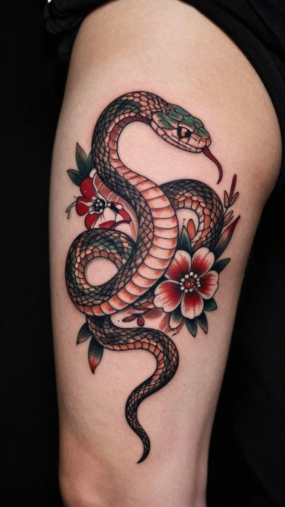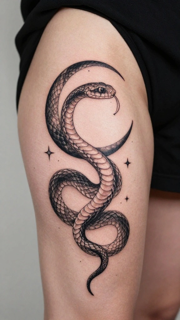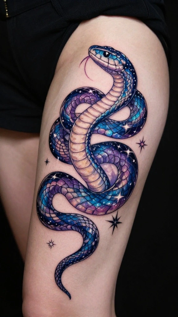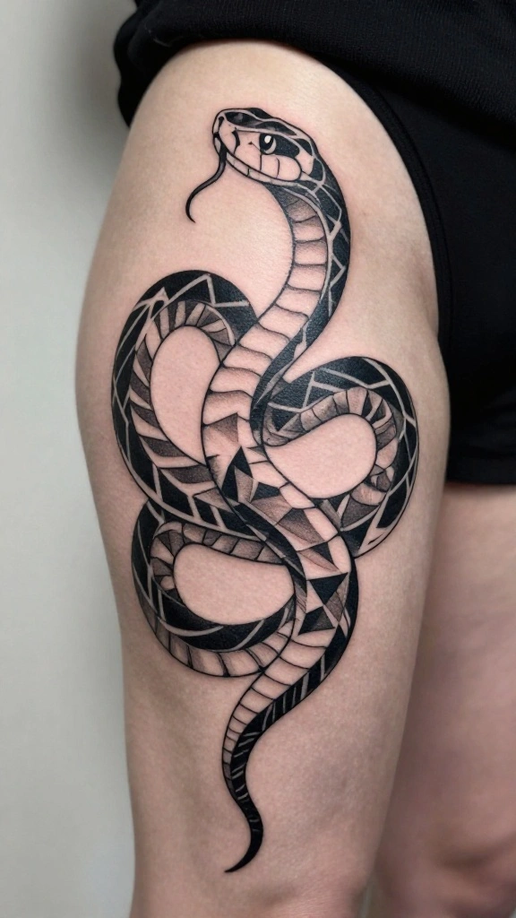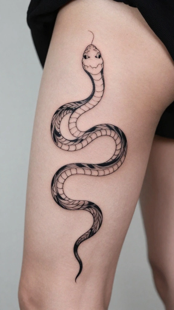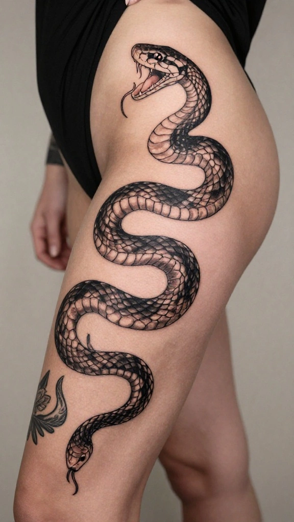 Snake thigh tattoos symbolize transformation, rebirth, and feminine empowerment, blending grace with strength. When choosing a design, think about how it will flow with the thigh’s curves—do you prefer a long, elegant snake that dances along your leg or a bold, coiled piece for a fierce statement? Explore snake tattoo designs across styles like realistic, minimalist, or geometric to find a look that matches your body art snake tattoos vibe. Also decide on placement (outer vs inner thigh) and color (black-and-gray vs color) to keep the result cohesive and wearable.