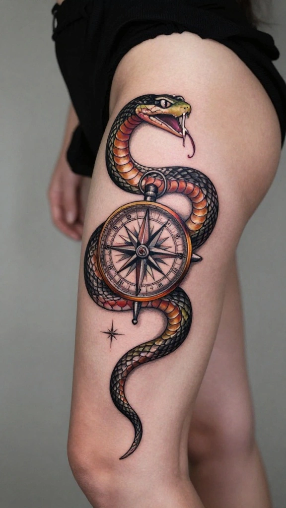 A snake and compass tattoo represents guidance and adventure, merging the wisdom of the serpent with the spirit of exploration. The compass symbolizes your life’s journey, while the snake adds depth of transformation and intuition.