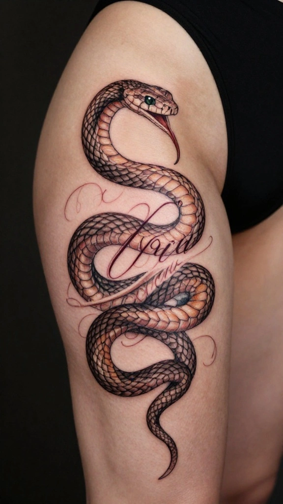 An elegant snake with script tattoo combines the allure of the serpent with meaningful phrases or words. This design allows you to create a deeply personal piece that reflects your values, beliefs, or inspirations, making it truly one-of-a-kind.