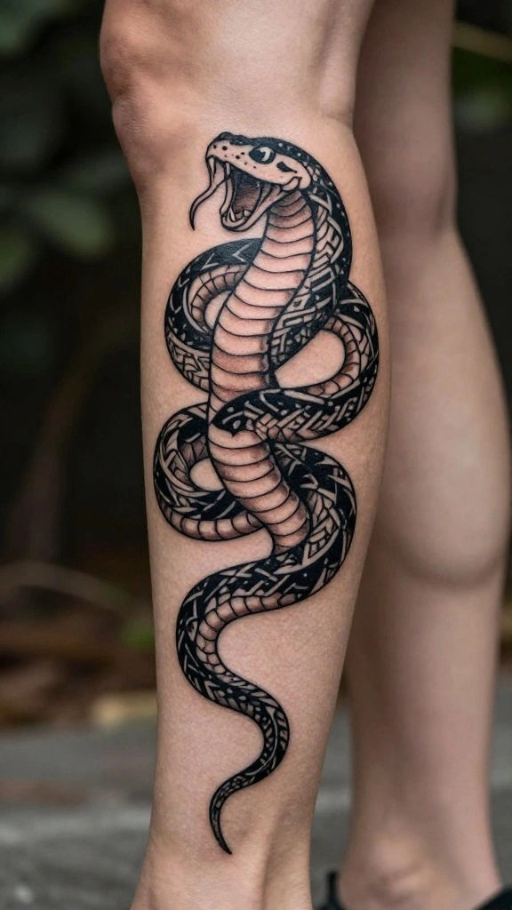 Fierce tribal snake tattoos are all about boldness and cultural depth. These striking designs feature sharp lines and intricate patterns that convey strength and heritage. Tribal tattoos often tell a story, connecting you to your roots or representing personal struggles and triumphs.