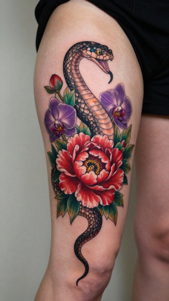 What do snake thigh tattoos symbolize, and how can I choose a design that feels both elegant and fierce?