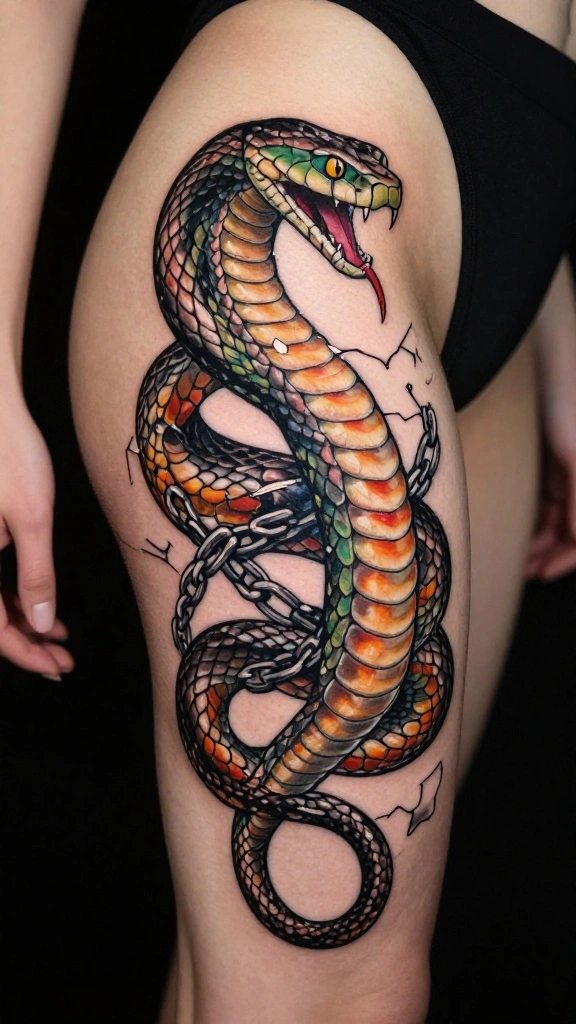 Fun fact: 67% of people choosing thigh tattoos snake with breaking chains report a stronger daily sense of liberation and resilience. The bold snake around shattered chains becomes a practical reminder to overcome every challenge.