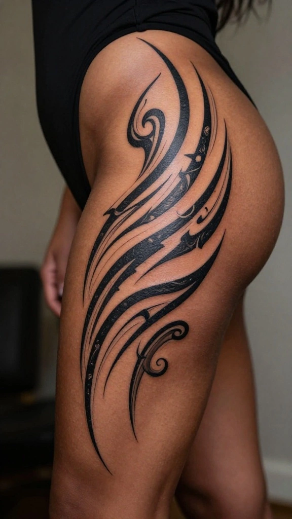 Tribal tattoos honor the rich heritage of various cultures, featuring bold designs and intricate patterns that can create powerful thigh art. These tattoos can symbolize strength, identity, and connection to your roots. The thigh provides ample space for expansive designs that flow with your body’s shape.