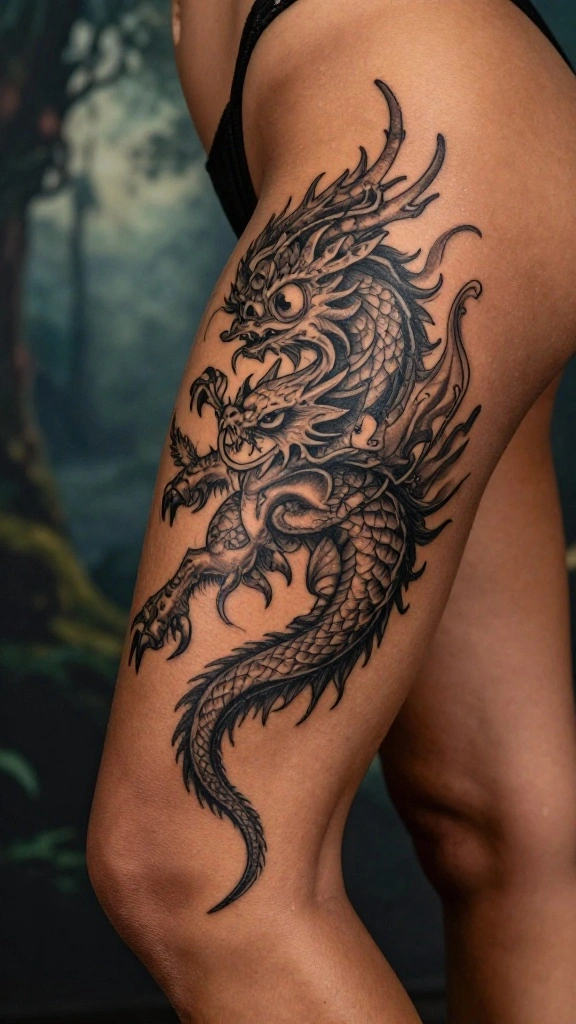 Fantasy and mythology tattoos allow for creativity and storytelling through body art. Featuring mythical creatures or legendary symbols, these tattoos can evoke wonder and express personal beliefs. Placed on the thigh, they become bold narratives that reflect your interests and imagination.