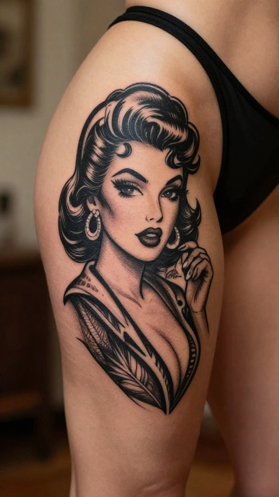 Vintage pin-up style tattoos celebrate classic beauty and femininity, often featuring glamorous women from the past. These designs can make a bold statement on the thigh, showcasing confidence and nostalgia. Depending on preference, the tattoos can be vibrant or kept in a timeless black ink style.
