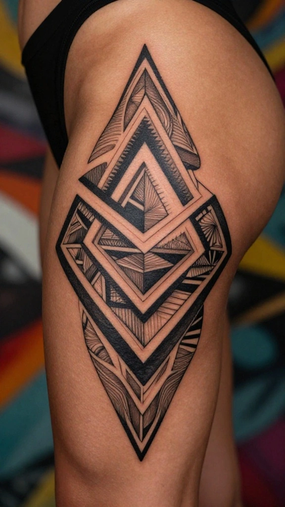 You might start with a simple triangle and eventually expand into a full thigh piece, seamlessly enhancing your body’s curves. The structured lines can create a striking visual impact that complements your shape.