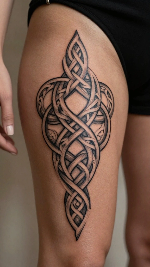 Celtic knots are timeless designs representing eternity and continuity, making them meaningful choices for thigh tattoos. The intricate, interwoven patterns can create striking visual impact, blending artistry with rich symbolism. For women of color, these tattoos can also connect with heritage and cultural identity.