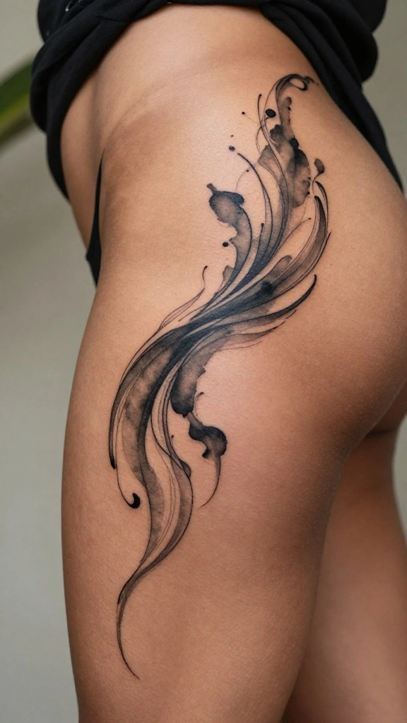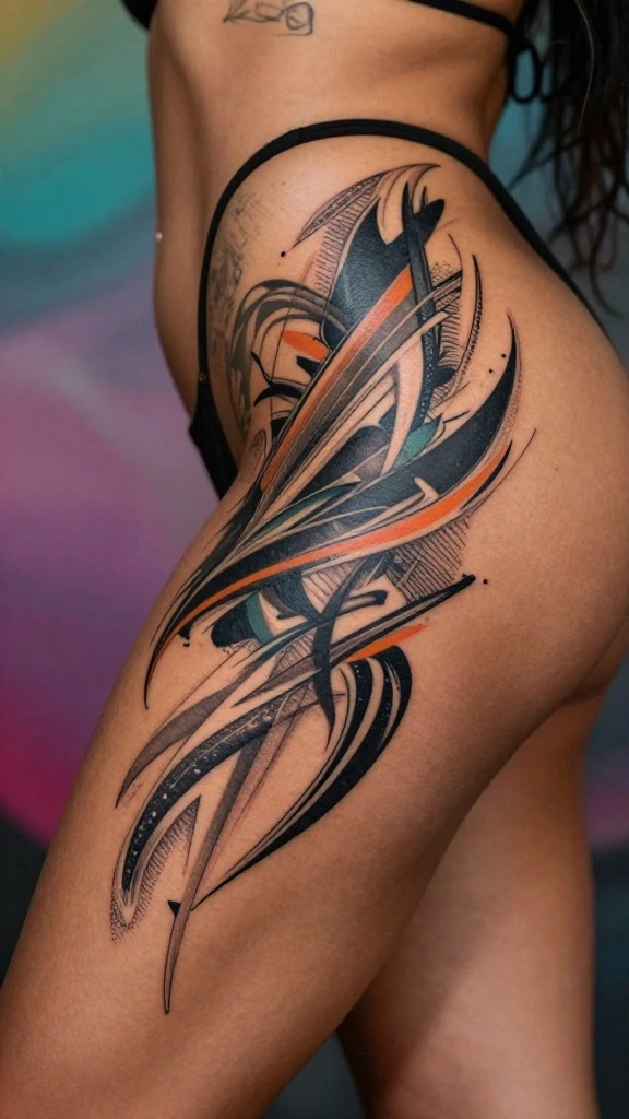 Abstract tattoos allow you to express your individuality through unique designs that defy traditional forms. Placed on the thigh, these tattoos can showcase vibrant colors and dynamic lines, adding movement to your look. With abstract art, the focus is on personal interpretation, making each piece distinctive.