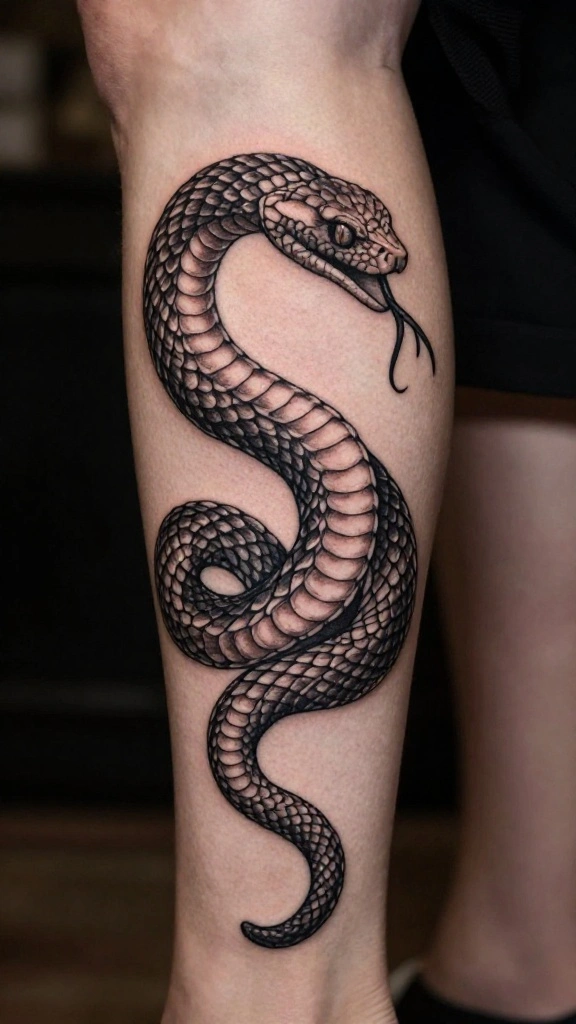 Absolutely. Feminine snake tattoos on the thigh often feature delicate lines, gentle shading, and curves that follow the leg’s shape. You can keep it monochrome for an timeless look or add subtle gray tones and tiny accents like petals or stars to lean into women snake tattoos aesthetics. Your artist can adapt body art snake designs to your skin tone and personal style, ensuring the piece remains elegant and expressive while still making a statement.