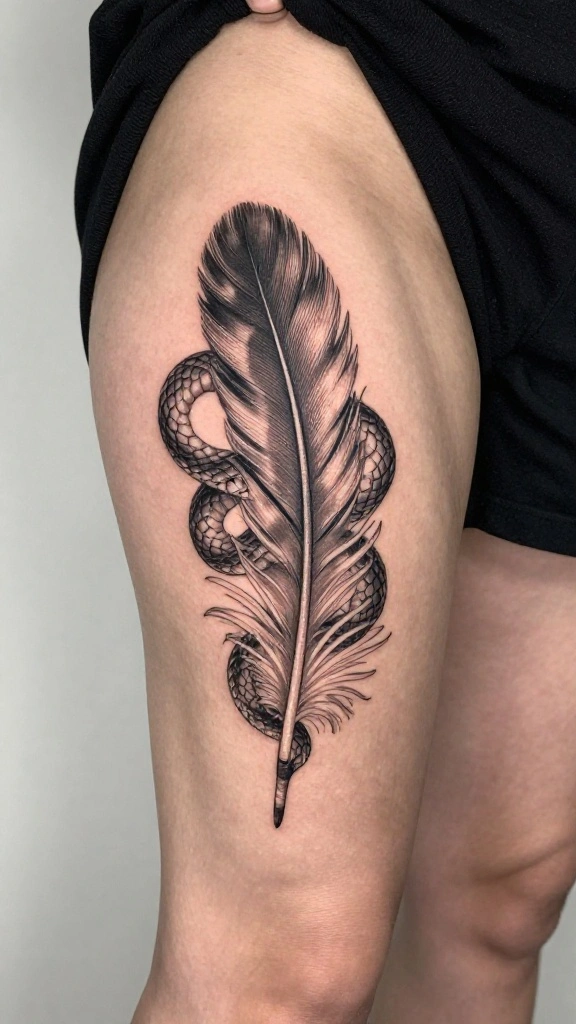 A snake intertwined with a feather combines two powerful symbols, representing freedom and transformation. This tattoo conveys a journey through change, making it a poignant choice for many.