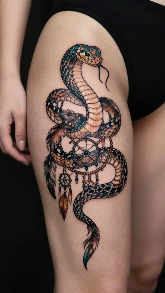 Consider incorporating a simple dot pattern or delicate scales to enhance texture without overwhelming the design. Choose a position on your thigh that accentuates your natural curves for maximum impact. Discuss color options with your tattoo artist; classic black and grey offer elegance, while a touch of green or gold can add a splash of flair.