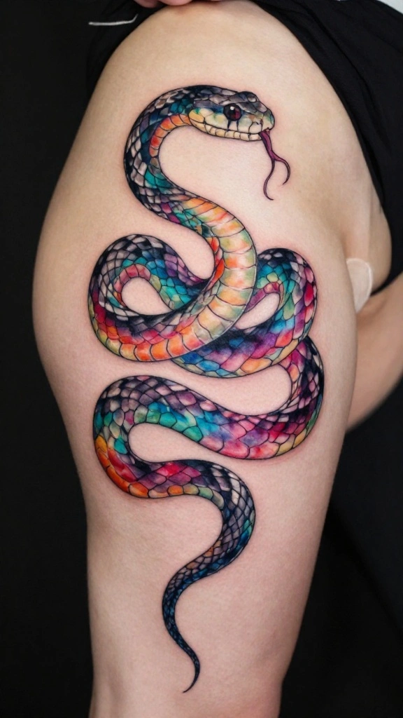 For those who love vibrant colors, a watercolor snake tattoo is an artistic and expressive choice. This design features a snake rendered in a watercolor effect, with beautiful splashes of color that resemble a painting on the skin. It’s perfect for women who seek a tattoo that reflects creativity and individuality.
