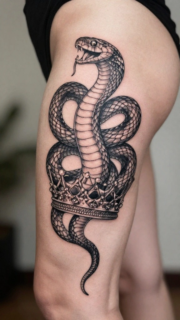 Choose an elegant crown with intricate details or a minimalist design for a modern touch. This tattoo works beautifully as a larger piece, allowing for more detailing in both the snake and the crown.