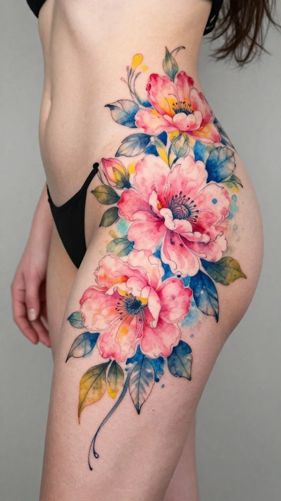 Watercolor floral tattoos offer an artistic flair, resembling vibrant watercolor paintings. These designs are known for their colorful and dreamy effect, making each tattoo unique. Women are particularly drawn to this style for its creative quality and the way it beautifully captures the essence of flowers.