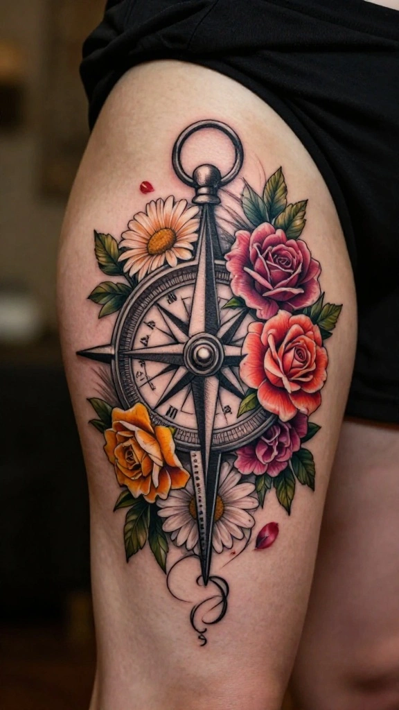 Floral compass tattoos beautifully merge nature and adventure, symbolizing guidance and exploration. By incorporating flowers into the compass design, you create a feminine touch that represents personal journeys and life paths. Women often select this design to express their love for travel or significant life events.