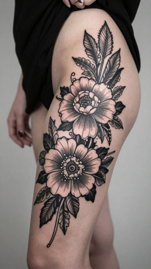 For women exploring traditional thigh tattoo designs in a vintage floral vibe, some classics stand out: a bouquet of roses or peonies, delicate jasmine sprigs, winding vines and scrollwork, or a pair of swallows among blooms. These are timeless staples in classic ink thigh tattoos and pair beautifully with intricate thigh tattoo patterns because they can be scaled and shaded with fine lines. When planning, consider black-and-gray versus color, the size and placement, and how the design will flow with your leg curves. Think about negative space to keep the look elegant and wearable with different outfits. Finally, choose an artist who specializes in vintage tattoo styles for women to ensure authentic linework and shading that lasts.