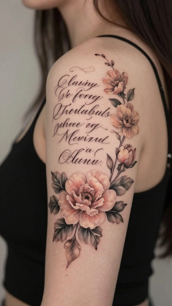 The floral components soften the script, merging art with personal expression to create a sentimental design. This tattoo becomes a story that resonates with your life experiences.
